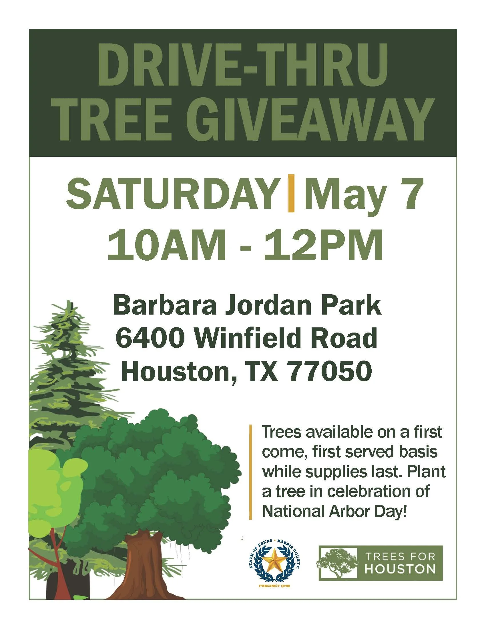 Harris County Precinct One is hosting a drive-thru tree giveaway at Barbara Jordan Park in celebration of National Arbor Day! Community members will be able to get FREE TREES, while supplies last, this Saturday, May 7th.